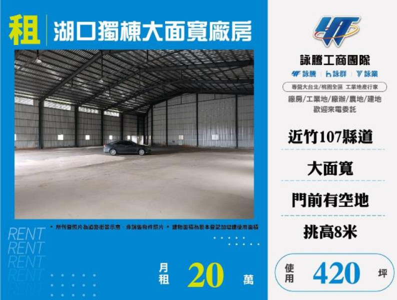 商品介紹:湖口獨棟大面寬廠房,臨路10米,挑高8米,電力設備 99馬,近竹107縣道、台15、台61、北湖車站,交通方便,大面寬,廠房挑高新穎,好規劃利用,正大馬路邊,門前有空地,大車好進出。