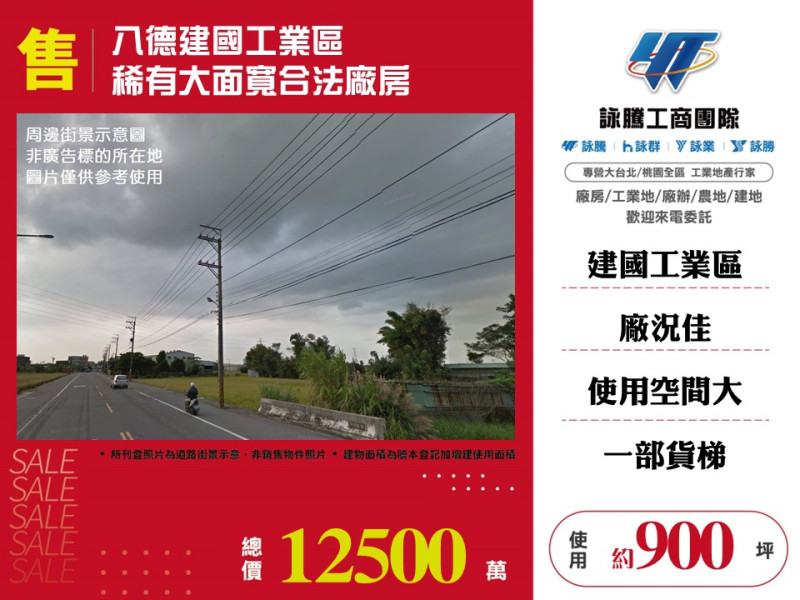 商品介紹:八德建國工業區稀有大面寬合法廠房,特色說明:臨路 約10米,挑高 約2.9米,電力 有,位於建國工業區內,緊鄰八擴重劃區,廠況良好,使用空間大,適合中小型科技業、加工廠。