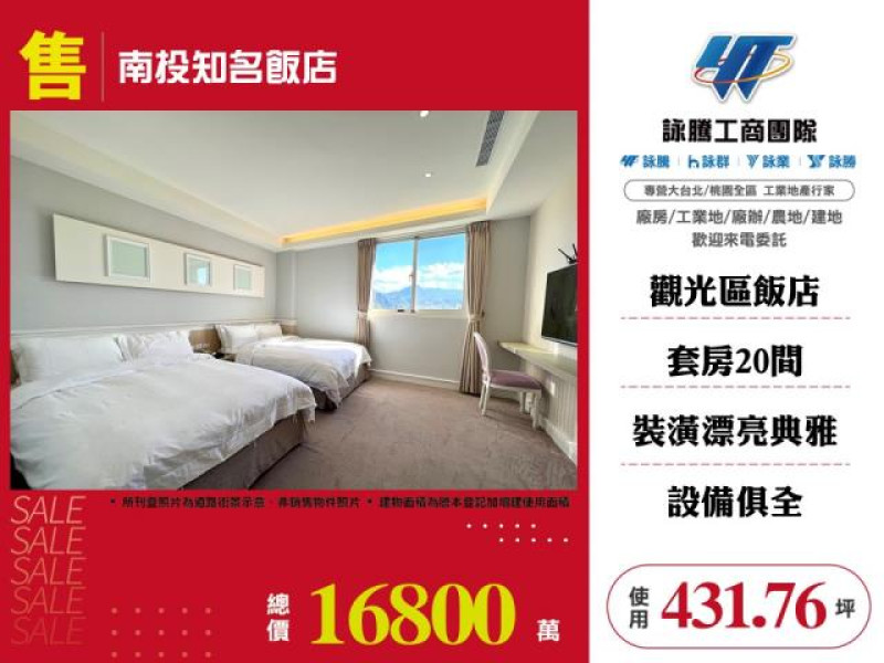 商品介紹:南投知名飯店,南投集集鎮觀光區內旅館,觀光景點集中,旅館腹地綠化植栽多,內部建置20個房間已裝潢,已經營多年有相關知名度,適合旅館業承接經營,建置費用可降低,並附設硬水轉軟水設備。