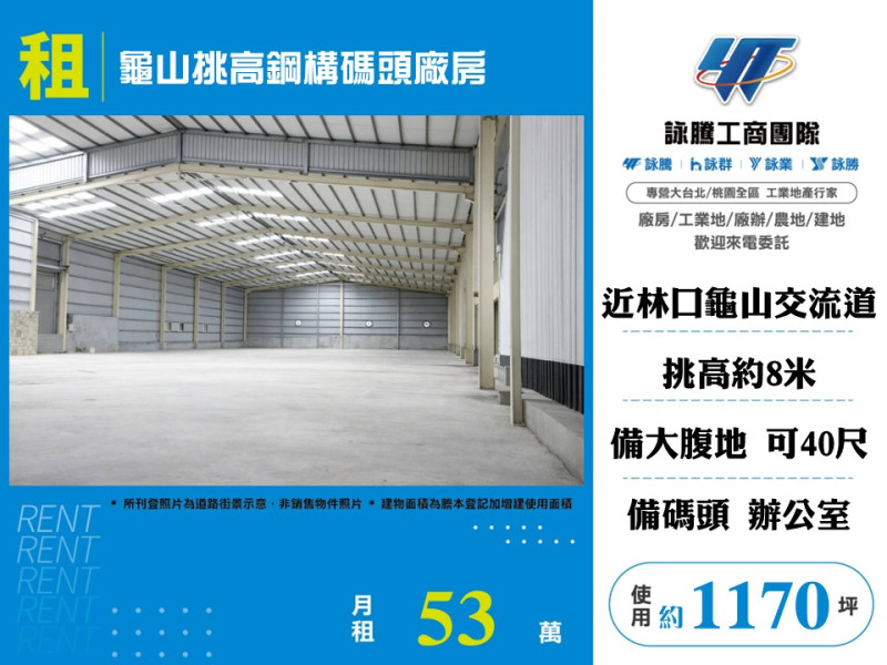 商品介紹:龜山挑高鋼構碼頭廠房,特色說明:臨路 約5米,挑高 約8米,近林口龜山交流道、中央警察大學,交通便利,好招募員工,單層挑高鋼構廠房,有夾層辦公室、電力99馬、附碼頭好使用,廠區附大腹地約300坪,40呎貨櫃車好出入停放。
