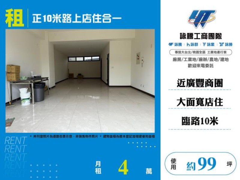 案名:正10米路上店住合一★租金:4萬★坪數:約99坪 (權狀+增建)★地理位置:近廣豐商圈