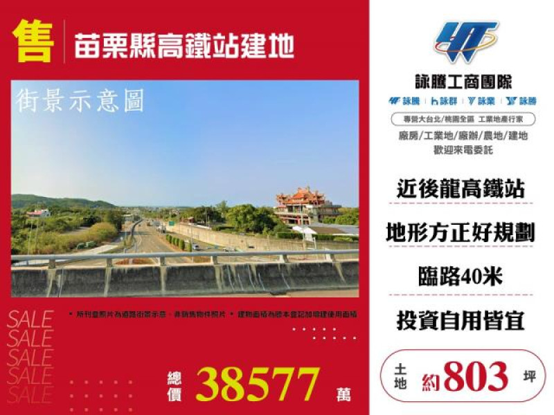 案名 :苗栗縣高鐵站建地★價格:38577萬★坪數:約803坪 (權狀+增建)★地理位置:近後龍高鐵站