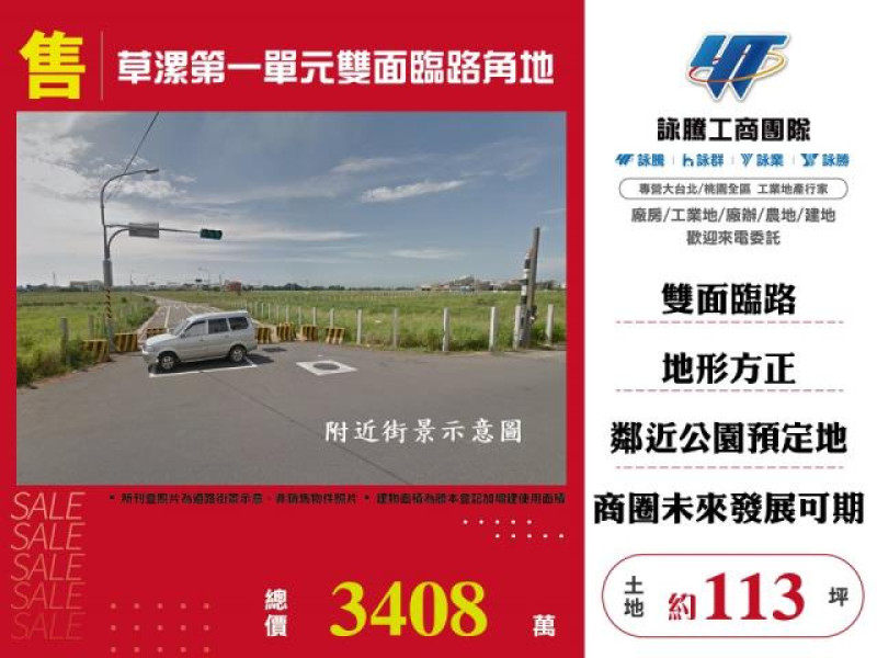 案名:草漯第一單元雙面臨路角地[價格]:3408萬[坪數]:約113坪【權狀+增建坪數】[地理位置]:近草漯重劃區