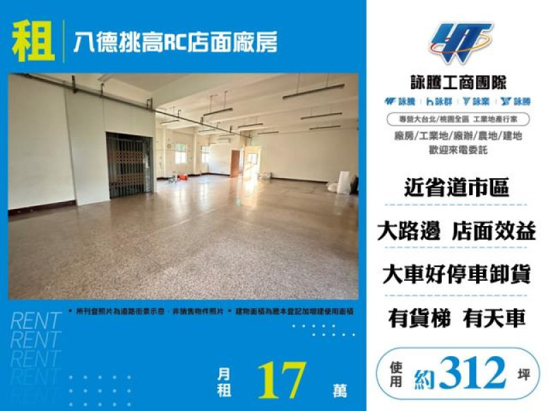 商品介紹:八德挑高RC店面廠房,特色說明:臨路 約12米,挑高 約3-4.5米,電力 三相220V/100馬,周邊: 八德國民運動中心,衛生福利部桃園醫院,省道市區,交通便利,有天車.獨立水電錶。