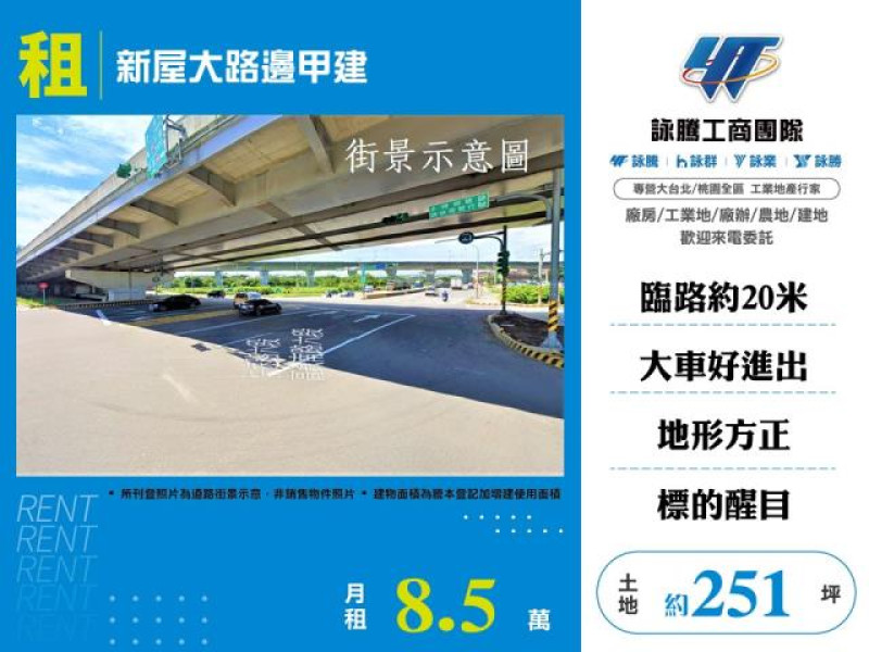 案名 :新屋大路邊甲建[租金]:8.5萬[坪數]:約251坪[交通幹道]:台31線