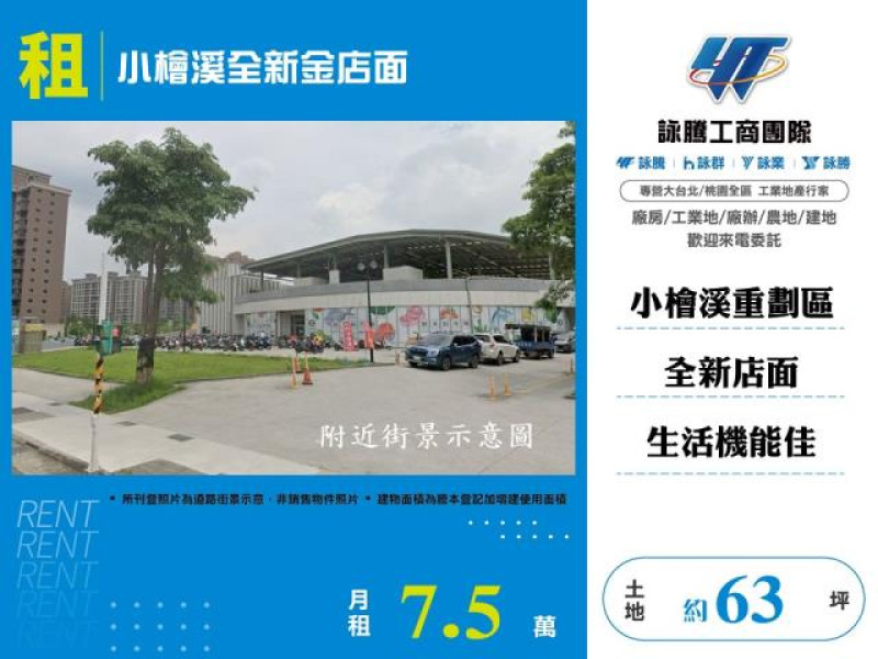 案名:小檜溪全新金店面[租金]:7.5萬[坪數]:約63坪[周邊]:小檜溪重劃區商圈