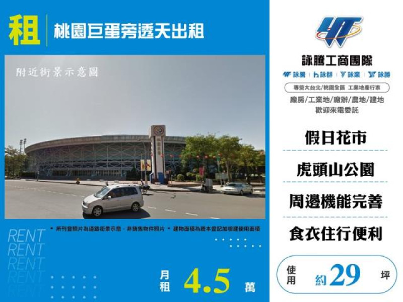 案名:巨蛋旁透天出租[租金]:4.5萬[坪數]:約29坪[周邊]:桃園巨蛋