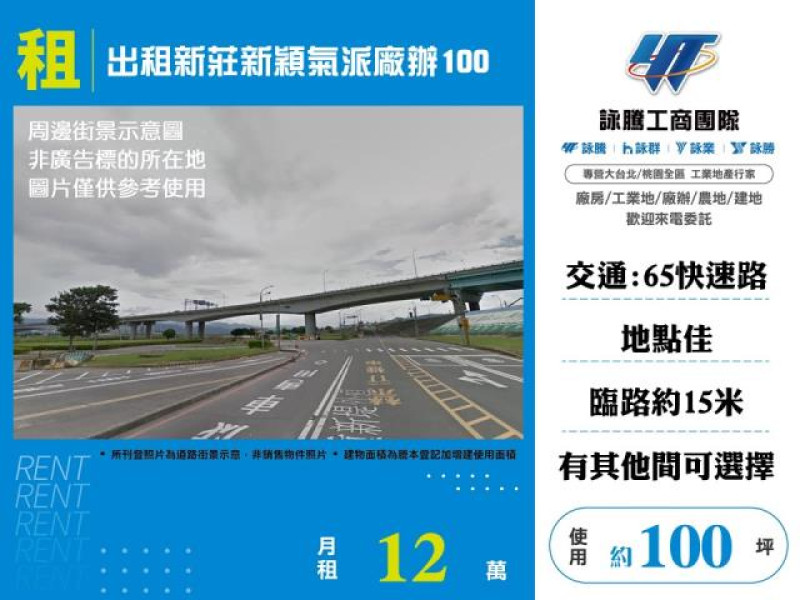 案名:出租新莊新穎氣派廠辦100[租金]:12萬[坪數]:約100坪[交通]:65快速路