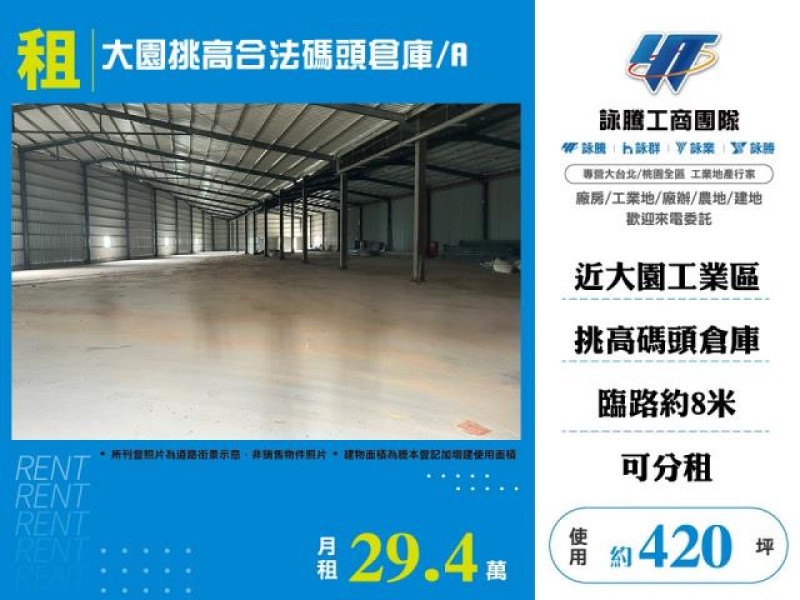 商品介紹:大園挑高碼頭廠房/A區,特色說明:臨路 約8米,挑高 約6米,電力 三相220V,大園工業區旁、61快速道路旁、交通便利,全新挑高合法廠房、40呎貨櫃車可進出。