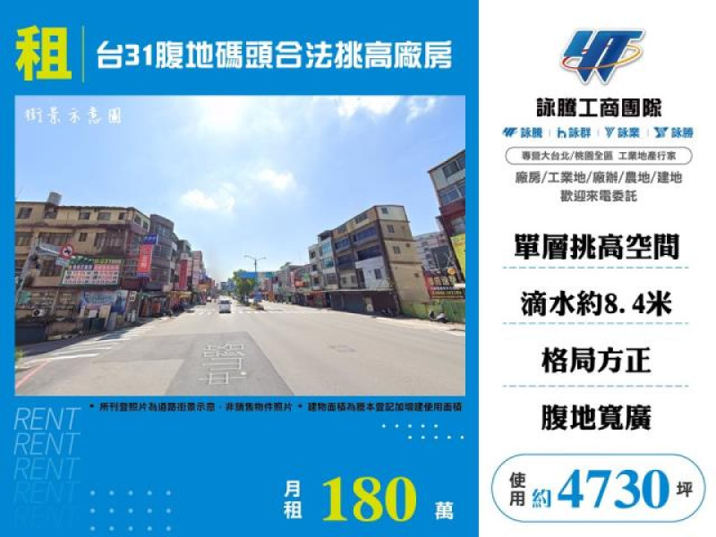 商品介紹:台31腹地碼頭合法挑高廠房,特色說明:臨路 約12米,挑高 約8.4米,電力 三相220V/380V,台31線,南北交通便捷,鄰近楊梅市區好招募員工,廠房單層挑高空間好利用,格局方正,規劃擺設容易,腹地寬廣,停車空間足夠,各式貨櫃等大車進出無虞。