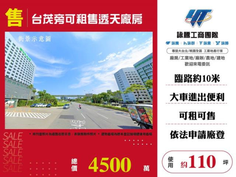 案名:台茂旁可租售透天廠房[價格]:4500萬[坪數]:約110坪[交通]:南崁交流道