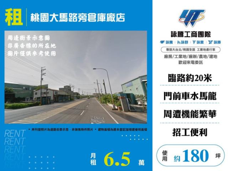 商品介紹:桃園大馬路旁倉庫廠店,特色說明:臨路 約20米,挑高 約7.5米,電力 三相220V,近桃園/蘆竹交流道,桃園及南崁市區,南北交通便利,鄰近藝文特區、中路特區等,周遭機能繁華好招工,具店面效應,門前車水馬龍,臨停方便。