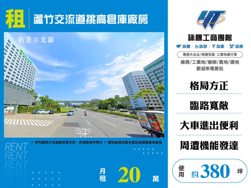 商品介紹:蘆竹交流道挑高倉庫廠房,特色說明:臨路 約10米,挑高 約8.5米,電力 三相220V,近蘆竹交流道,往返桃園.大竹.南崁快速便捷,周遭機能發達好招工,臨路寬敞大車進出容易,格局方正,廠房挑高好利用。