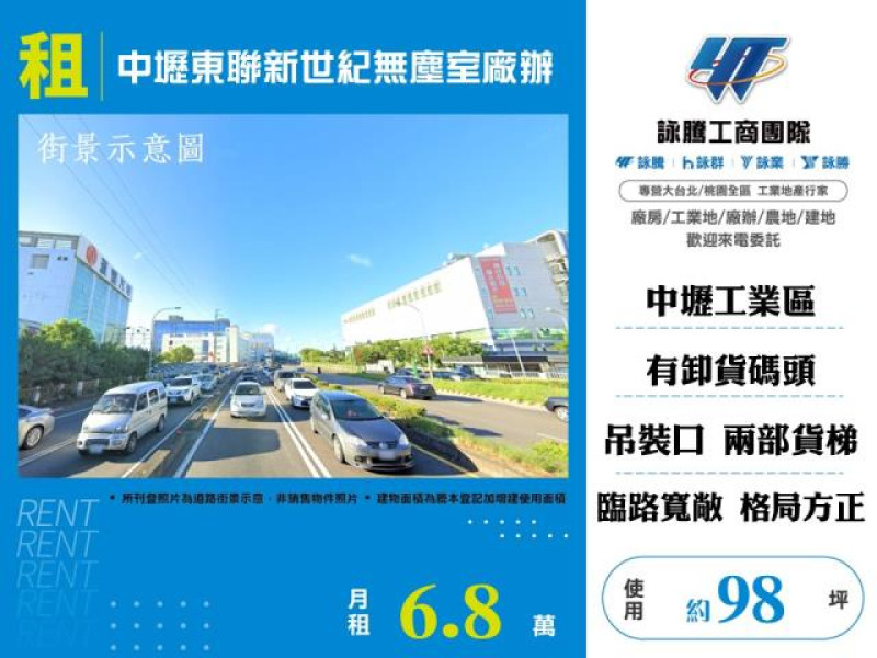 商品介紹:中壢東聯新世紀無塵室廠辦,特色說明:正中壢工業區,近國1及市區,交通便利好招工,備卸貨碼頭、吊裝口、貨梯*2,外型新穎大氣,臨路寬敞,廠內方正好規劃,廠區24HR保全。