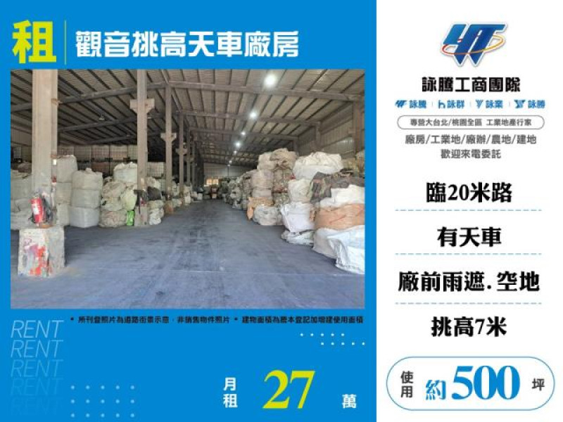 商品介紹:觀音挑高天車廠房,特色說明:臨路 約20米,挑高 約7米,電力 三相220V,正路邊挑高廠房、備牛腿、備腹地、好停車卸貨,近觀音工業區、61快速道路。