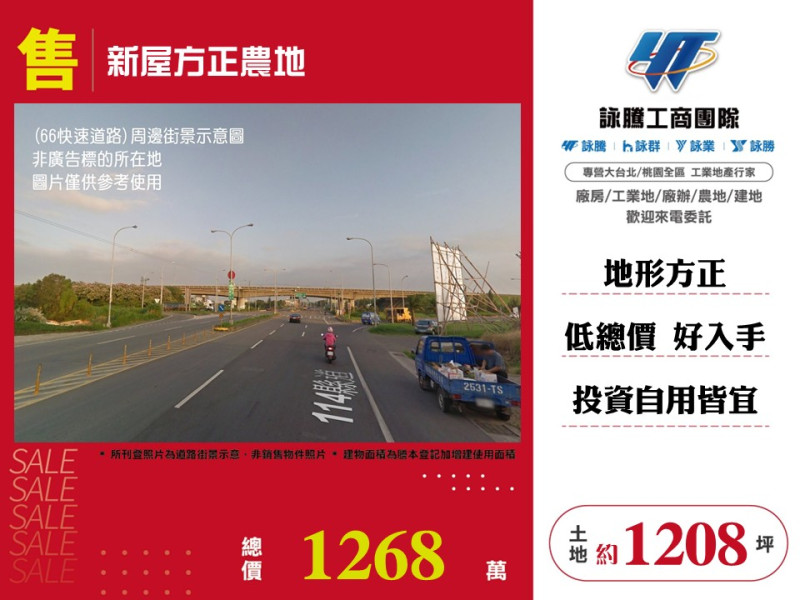 案名: 新屋方正農地[價格]:1268萬[土地坪數]:約1208坪[周邊]: 近66快速道路