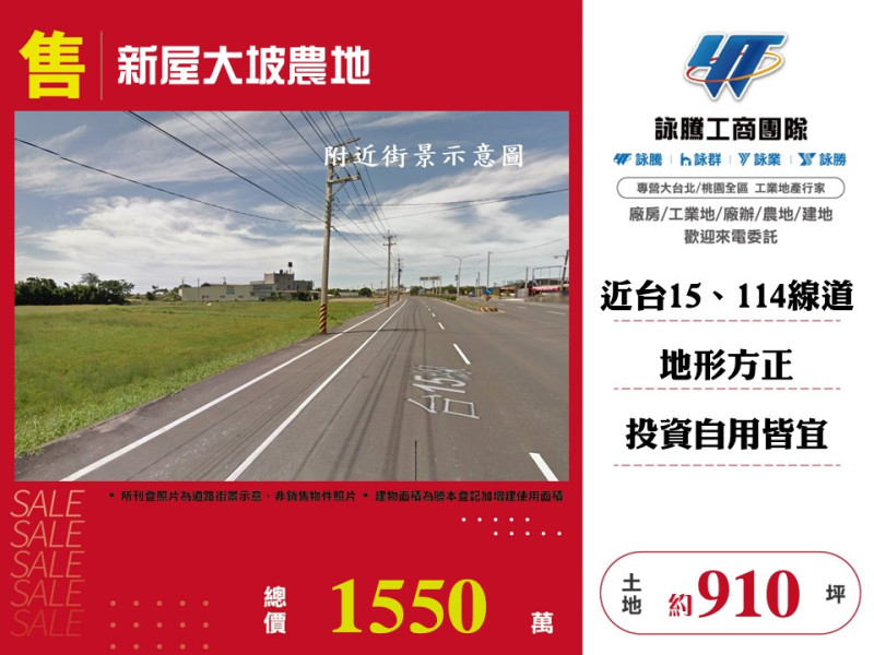 案名: 新屋大坡農地[價格]:1550萬[土地坪數]:約910坪[周邊]: 近台15線道