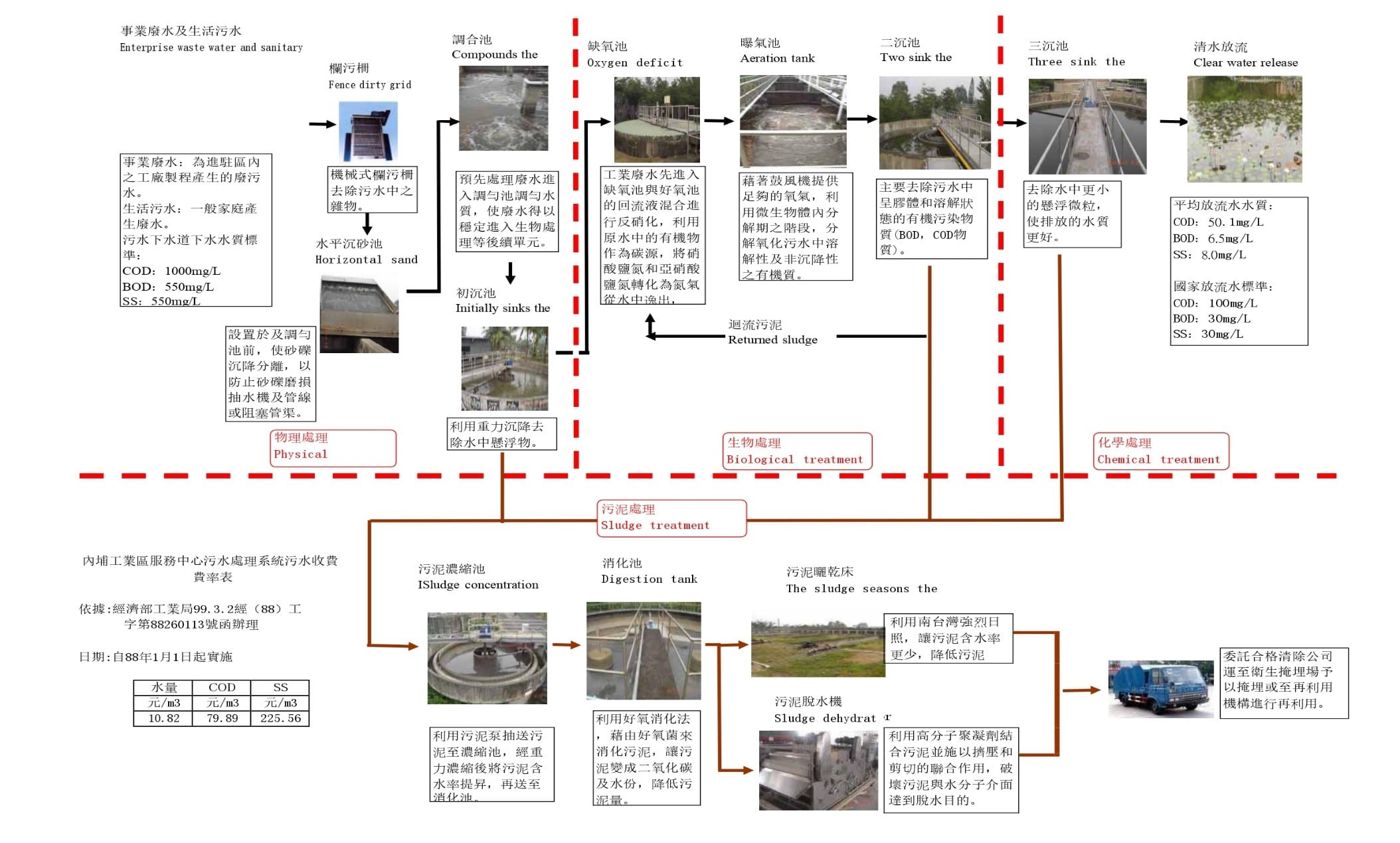 事業廢水及生活污水 -> 欄污柵 -> 水平沉砂池 -> 調合池 -> 刀沉池 -> 生物處理流程
